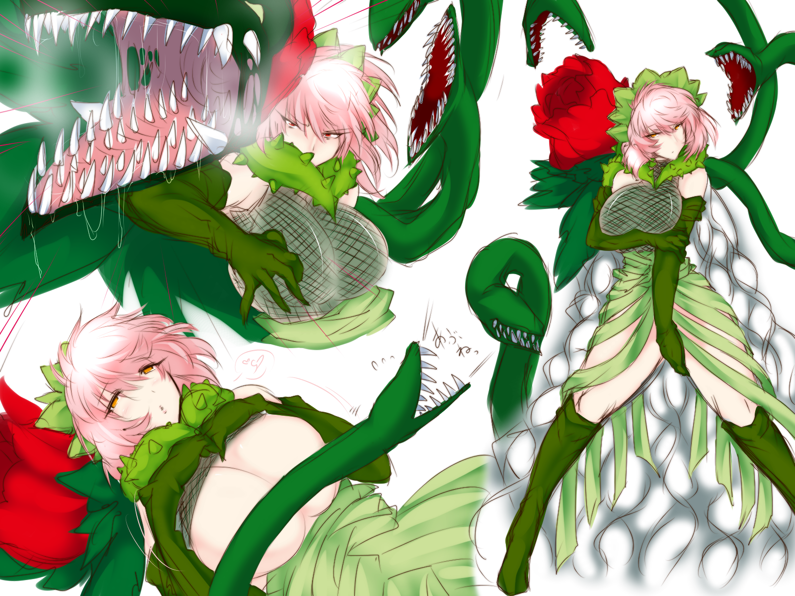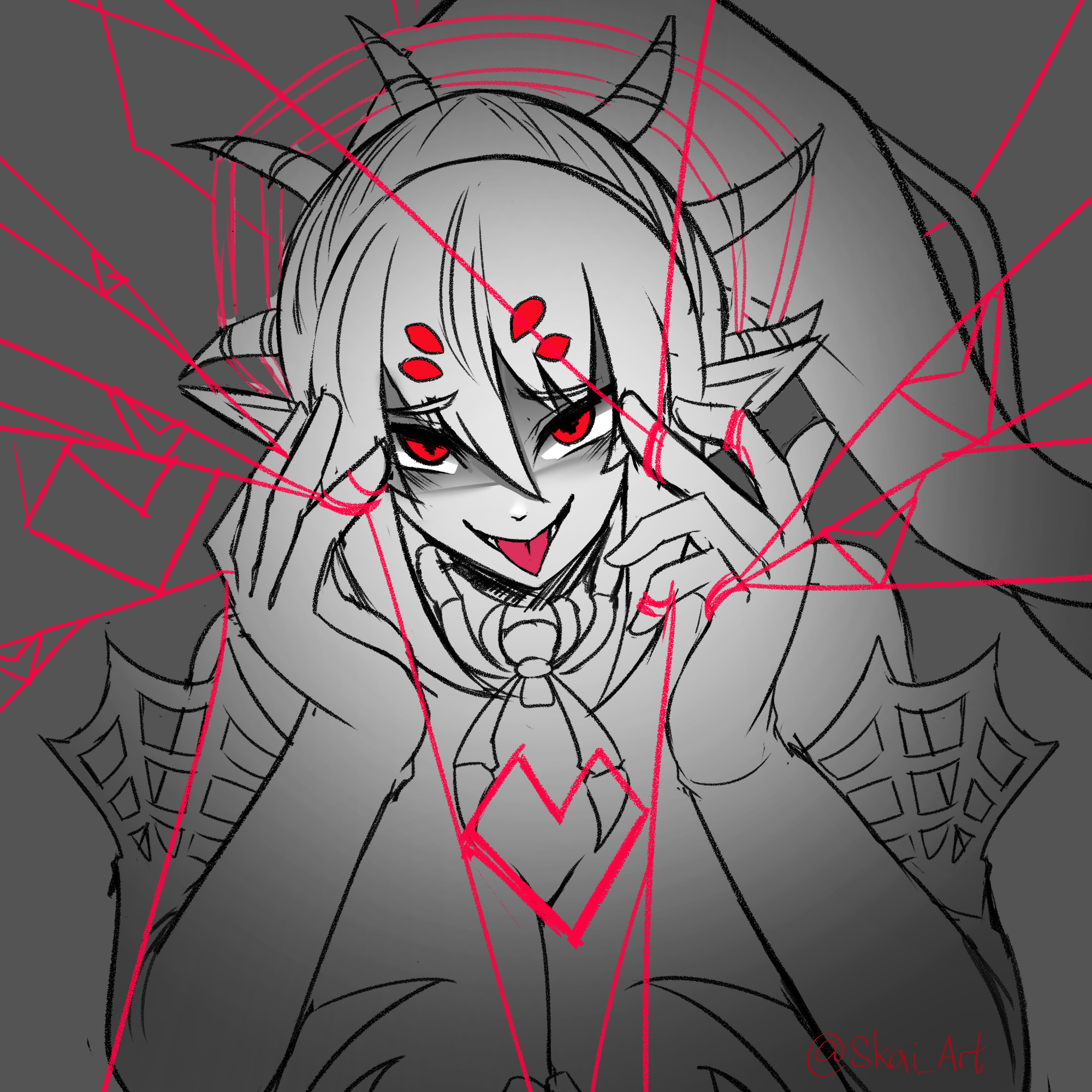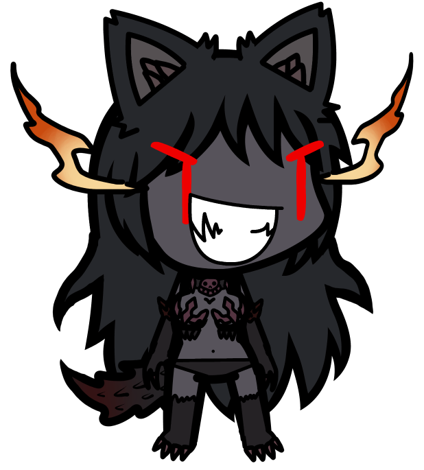 >she doesn’t say anything, but this maniacal grin and those bright-red eyes tell you more than enough