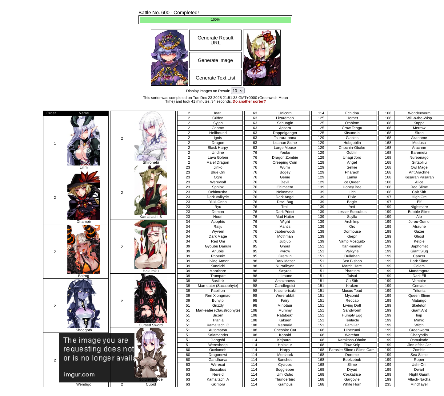 >>63771 >The image you are requesting does not or is no longer availa imgur.com KC gets crazier with his designs each day. Jokes aside, you seem to like very agressive mamono. And if the sorter isn't very accurate to your actual likes, i'd recomend you do the sorter instead. It's a lot quicker, and you get a constant overview of your rankings instead of guessing where you've positioned who and why.