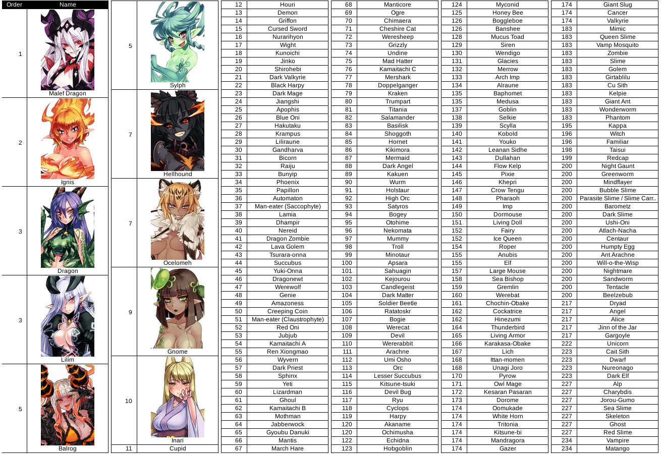Well, the sorter isn't really accurate. A lot of monsters are placed way too low (Ryus should be at least at 30+, Shogs are WAY too low etc.) Also I've accidentally fucked up Undine. She should be in 35+. mah bad