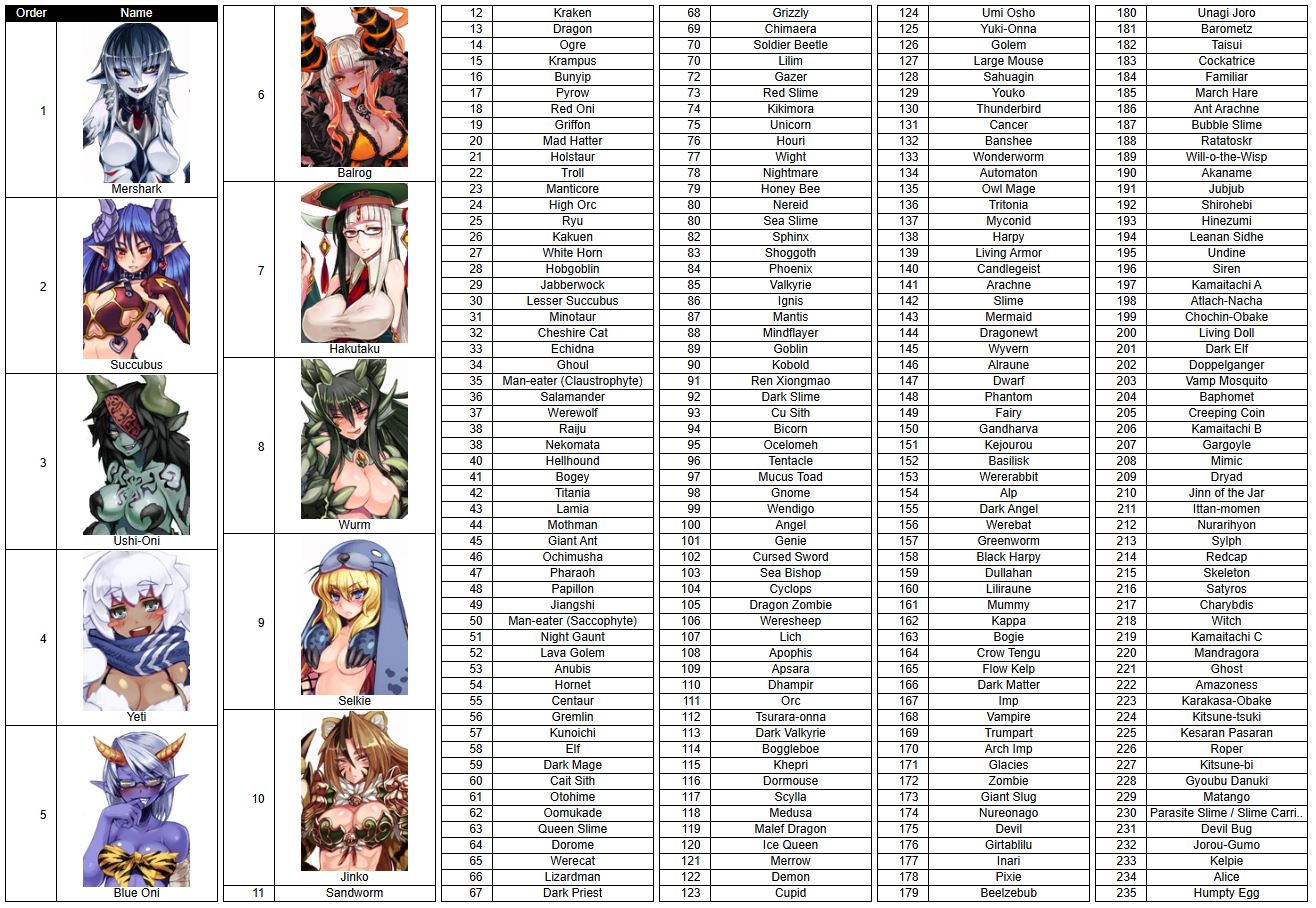 I finally finished. The profile pictures not being representative and even the size descriptions not meaning much forced me to think about things a lot. Girls aren't sorted within their tiers, and for the sorter I treated kamaitachi A, B, and C as one monster since they're a package deal and mentally filed both youko and inari under "kitsune." I didn't let myself use the tie button. If I did the sorter again I'd probably get slightly different results, so don't mind the absolute sorting TOO much. I also really had to force myself not to think too much and just go with my gut or I never would've finished, the sorter is tough.