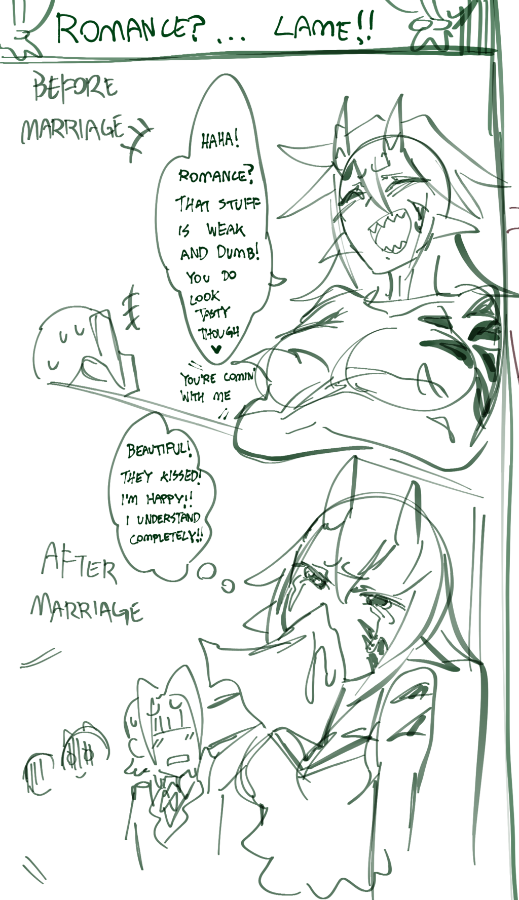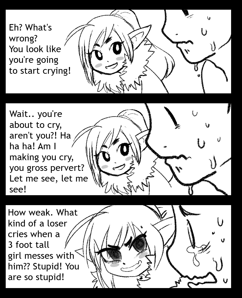 >>45461 >What stupid ideas would they come up with? Dhampir is always coming up with new ways to defeat the oppressing Vampire matriarchy(er om and sis). Ogre, of course, is always up to a good fight, and grem keeps coming up with new contraptions and using the ogre for free manual labor. Then whenever they get defeated they switch out the tune and say they need to train more, which ends up with anon being swarmed and trained by three sweaty tomboys far stronger than him. One time ogre and grem had the brilliant idea of turning the nearby swamp into a SUPERswamp that can reverse the salinity of seawater and extract the salt. Luckily anon was able to stop all three before every saltwater species in the vicinity had a really bat time(the training paid off, just not in the way they intended to). They did manage to get enough salt to confine the matriarchy in their "Castle of Terror" for 2 days, but as an "unintended" consequence the vampire had to sleep over on anon's house because she couldn't enter either.