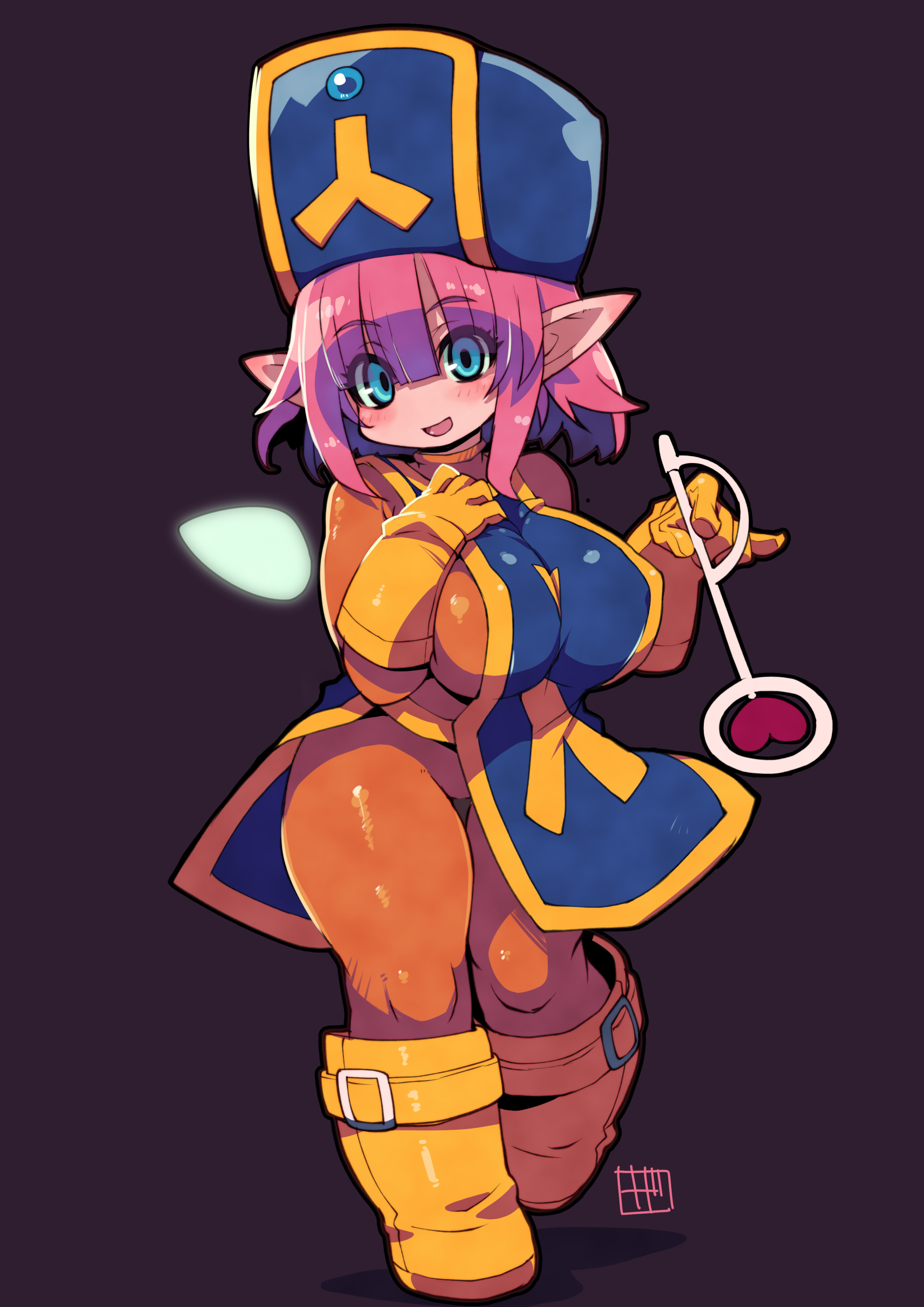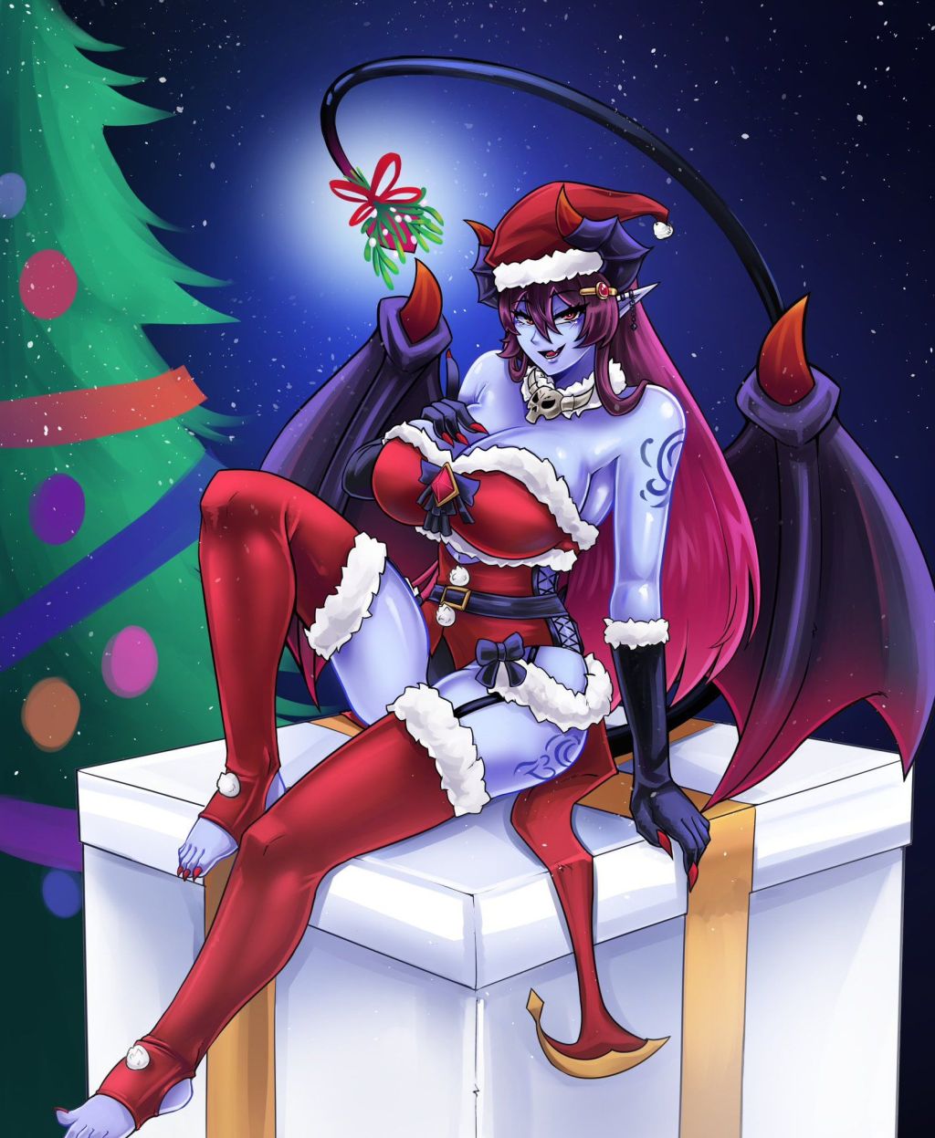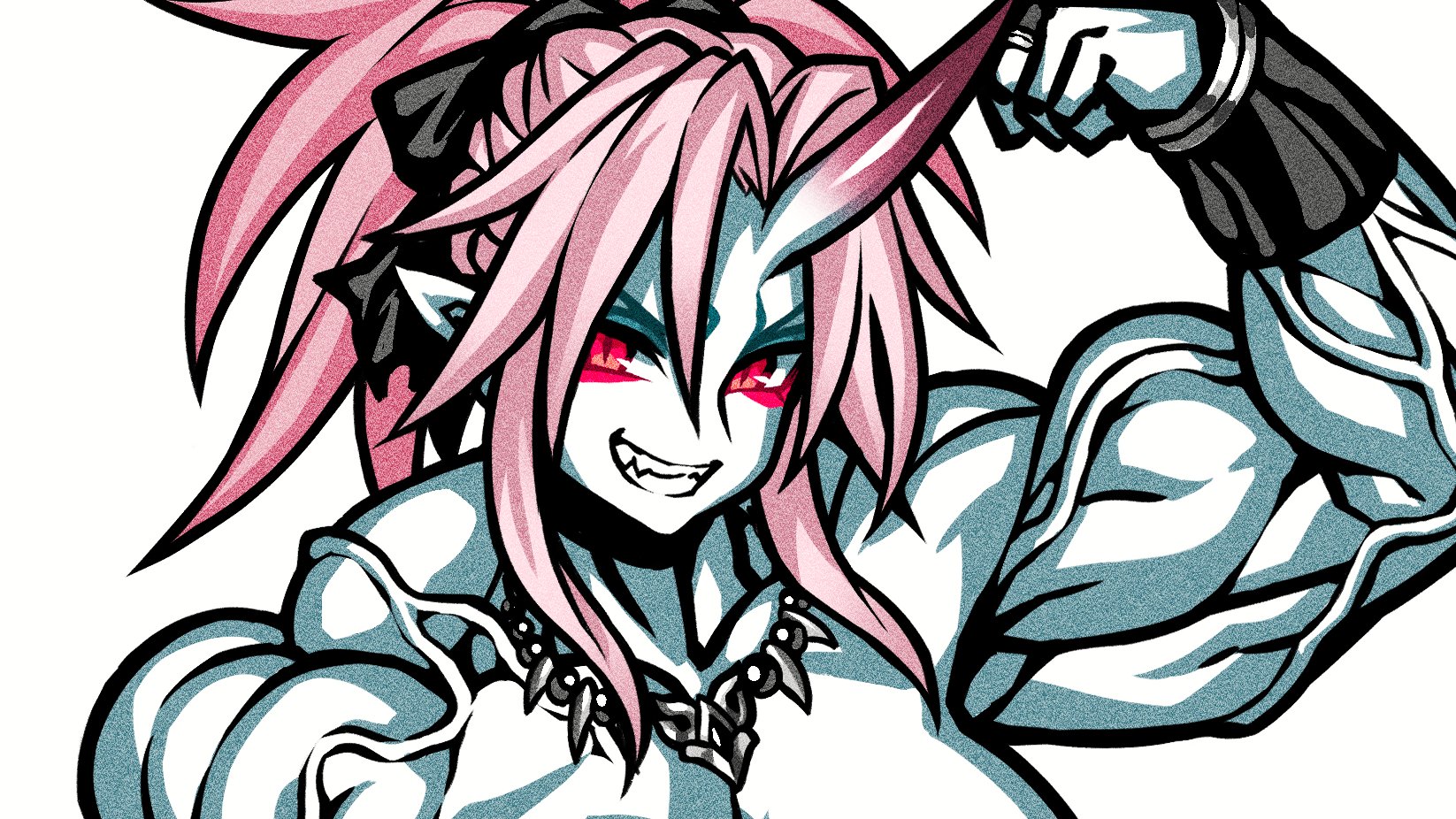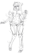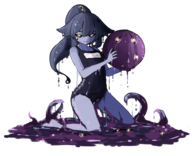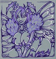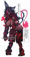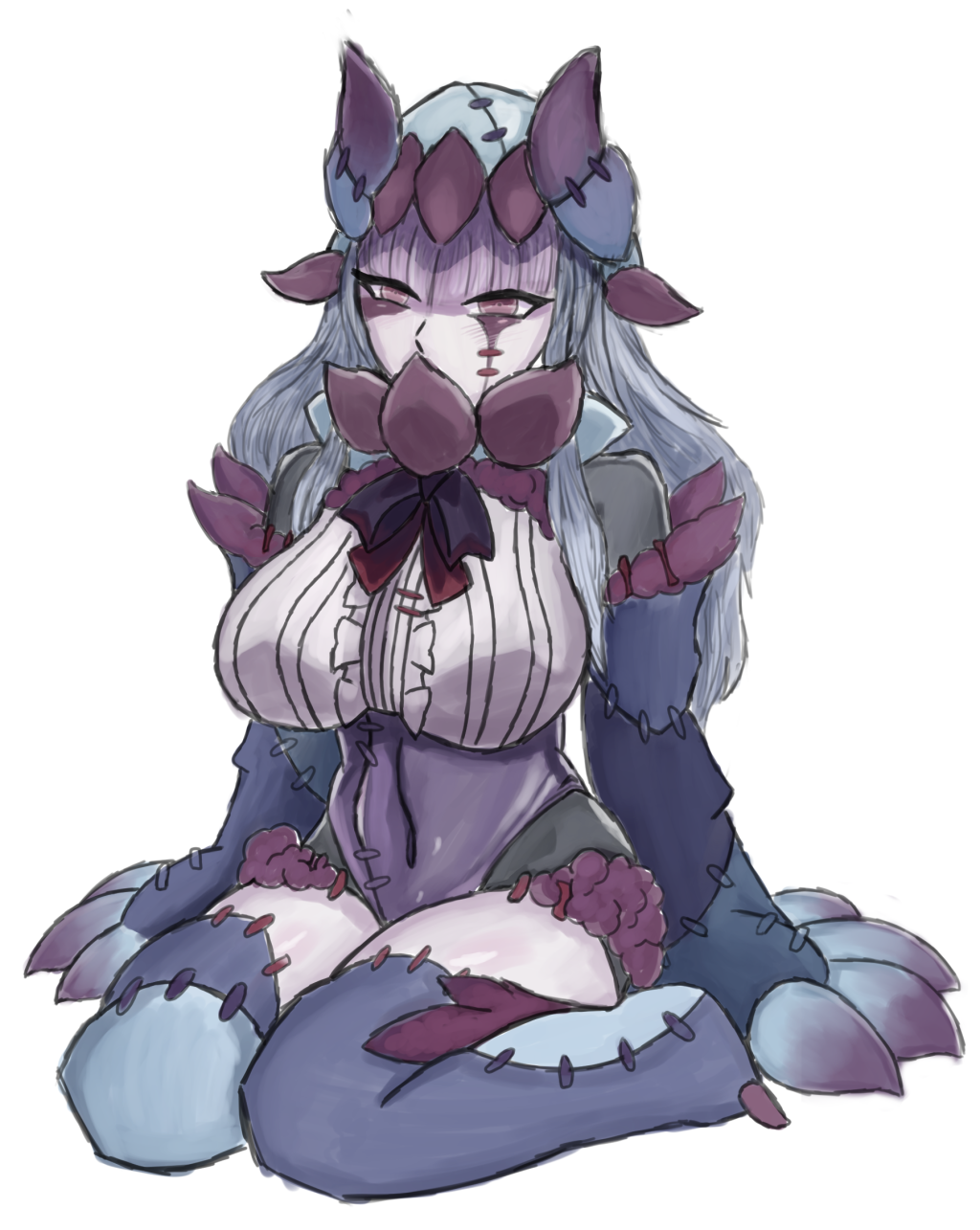 The purple covering over the abaddon's human-like skin is a protective membrane. While able to absorb great impacts, it tends to tear easily, such as when they find prey and release a lot of pheromones. However, it also regenerates quickly. The abaddon folk in the illustration does not have these membranes, but some of them do.
