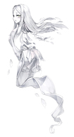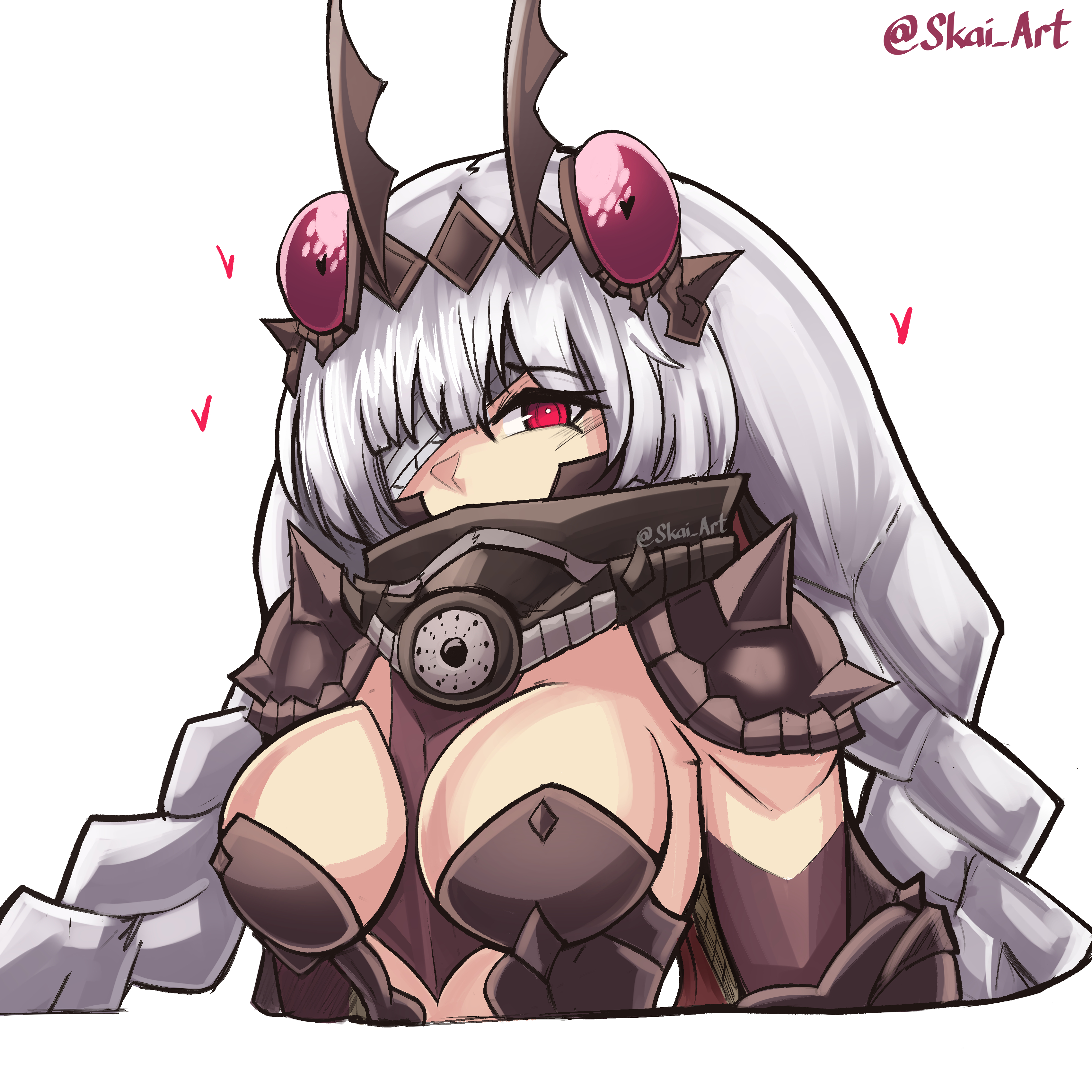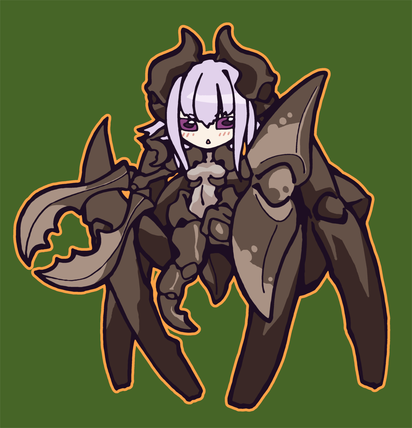 As far as artificial things on her body, the abaddon has her gas mask, the flared shorts, a scarf and belts with bags on her insect abdomen. The same is true for abaddon folk except for lacking the belts and bags. Everything else is membrane or exoskeleton, including the armor with teeth-like projections around the breasts. (source: Personal communication with KC)